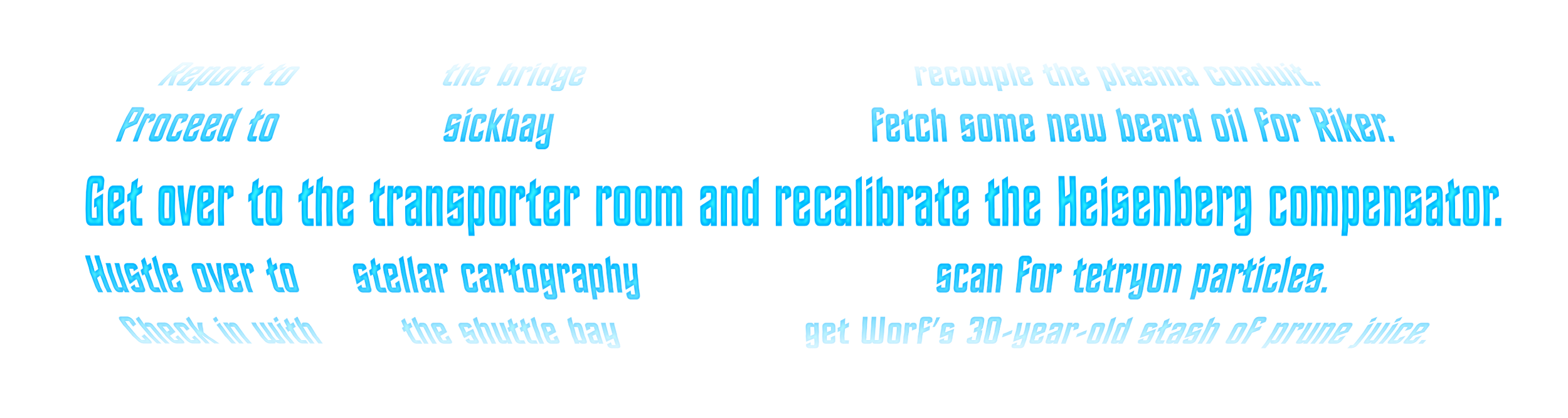First I drafted custom reply fragments using authentic Star Trek technobabble and references. For example, I made a list of locations on the ship, a list of actions a Starfleet officer might carry out, etc.